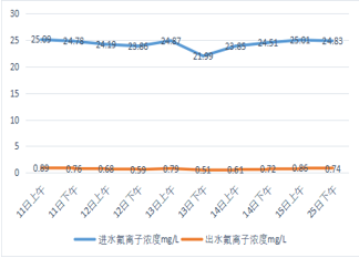 水廠情況:水量40 方/小時倍,部分煤內氟化物轉至脫進水氟濃度:20~25 mg/L