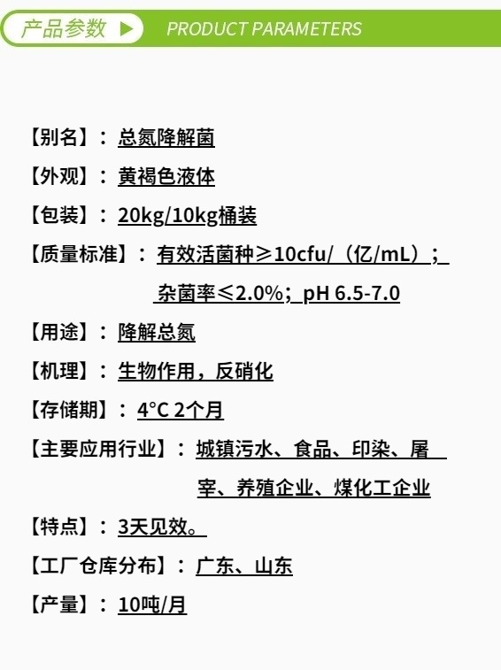 總氮激活菌101是針對(duì)生化系統(tǒng)中高濃度總氮廢水而專門(mén)研發(fā)的高效反硝化菌,能高效降解廢水中的硝態(tài)氮、亞硝態(tài)氮等氮化合物,可在各種復(fù)雜廢水中與其它產(chǎn)品配合使用。